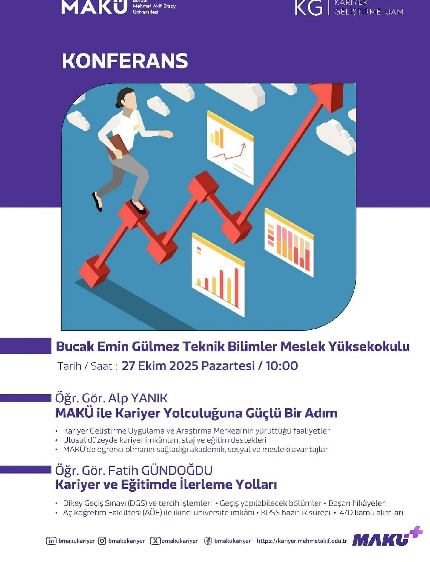 MAKÜ Career Development Application and Research Center will organize a conference titled “A Strong Step to Career Journey with MAKÜ” at our college on Monday, October 27, 2025, at 10:00 in our college's Lecturer Mustafa Mürsel ESKİCİ Conference Hall.